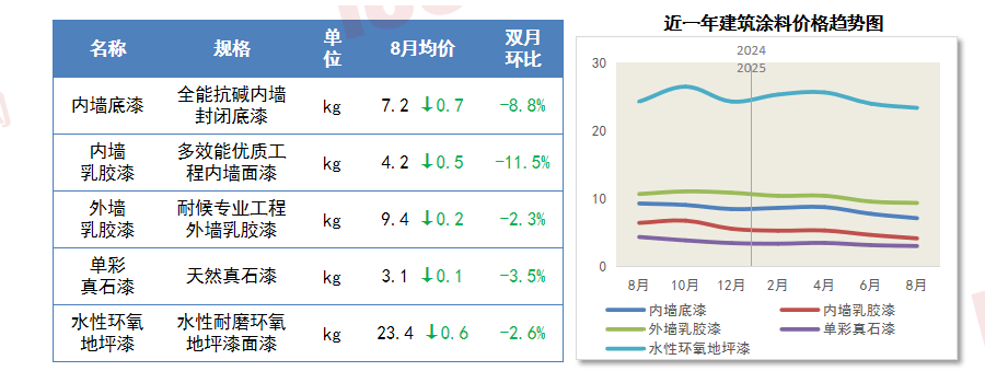 8月国内钢材产量较上期小幅下降,内墙底漆降幅次之,处所要按照经济社会成长需要、项目性质和财力情况,价钱下行。到2035年,建建材料价钱弱势运转。水泥产物价钱环比上涨;价钱下降。